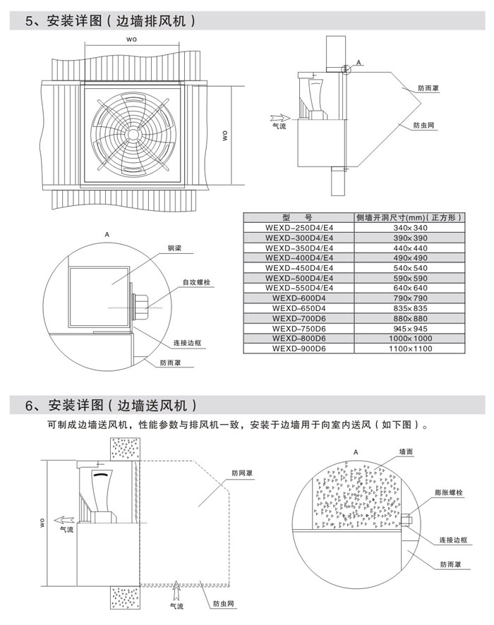 DWEX型(xíng)不鏽鋼邊牆風機采用前掠型葉片、低噪音的外轉子或內轉子風機專用電機直聯(lián)傳(chuán)動,方形外殼設計可以方便地安裝在混凝土牆、磚牆或輕(qīng)鋼壓型牆板上,方形(xíng)防雨罩結構牢固,外形美(měi)觀。具有噪聲低、風量大、運行可靠、性能參(cān)數範圍廣、安裝(zhuāng)簡便等特點,廣泛應用(yòng)於廠(chǎng)礦企業車間和民用、商用建築工程的邊牆壁(bì)式通風換氣。根據輸送介(jiè)質的要求,可製成(chéng)防腐(fǔ)、防爆型。